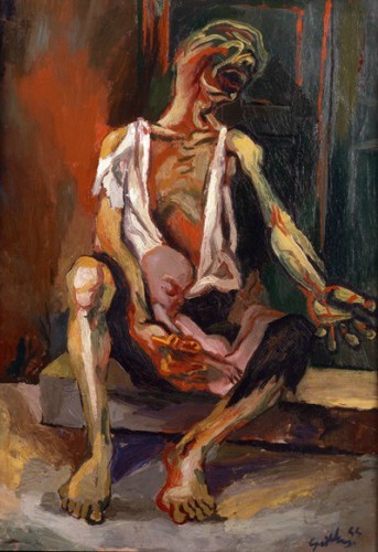 Il “mondo degli umili” a cui Guttuso ha dedicato grandi energie creative, culturali e di militanza politica, è la prima tappa di questo viaggio nel suo lungo percorso, in quanto assume il fondamentale valore di luogo originario, di habitat primario. Un mondo, la Sicilia dei primi del ‘900, inimmaginabile oggi senza l’uso di strumenti letterari, ma percettibile in tutta la sua tragicità in rapporto alla persistente drammaticità dei suoi caratteri. Ed è dall’informazione recente con la sua volontà di intervento e risanamento che si possono cogliere le qualità della testimonianza pittorica di Guttuso, assolutamente lontana da umori retorici e cruda quanto solo l’intensità psicologica, nella volontà espressiva e nella tappa ricettiva, è possibile proiettare. Sottolineare il valore dell’impressione psichica sulla descrizione e la riconoscibilità, è proprio la strategia critica per questo periodo creativo del Maestro siciliano, che quindi si definirà con attributi chiaramente diversi rispetto a limitative definizioni realistiche. Le due opere si presentano, pur con caratteri diversi, assolutamente concentrate all’interno della propria singolare ed autonoma specificità, per cui il messaggio è, in entrambe assolutamente diretto alla sensibilità, senza possibili diversificazioni formali, orpelli o citazioni, e quindi tanto compatte da risultare relatrici di un messaggio così diretto alla sensibilità del lettore, da risultare in posizione enigmatica, con valore interrogativo e senza gratificante risposta.