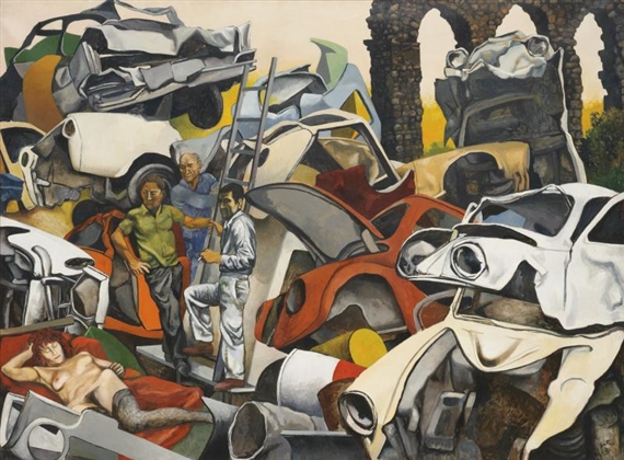 Dalle antiche, alle moderne rovine, secondo un itinerario che conferma l’emarginazione, il crollo dei valori… “Esistono davvero dei cimiteri di automobili a ridosso dell’acquedotto di Clodio, all’estrema periferia di Roma, dove lavorano degli operai e dove si trovano delle prostitute con cui gli operai si ristorano. Io ho fatto la cronaca di ciò che accade. Questo quadro, come gli altri miei, è immediatamente comprensibile. Ma allo stesso tempo può significare altro. Questi rottami sono il simbolo del ritmo divorante del consumismo, che diventa paesaggio…” (R.G. in “Oggi” dell’ll/1/80). Dalla dichiarazione dell’artista, si intuisce l’assenza di una prospettiva, che non sia quella di una interiore costruttiva riflessione individuale, e quindi unica soluzione per le “correzioni” future.