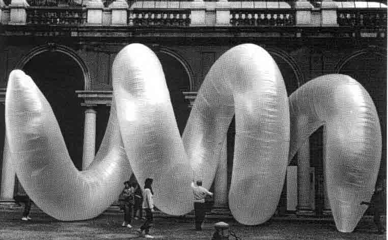 Le grandi forme plastico-gonfiabili e policrome distribuite nel centro storico, istallate lì dove la monumentalità ci aveva abituato ai valori iconografici, alla nobiltà sovrastrutturale dei materiali ed alla simbologia aggiuntiva del peso, appaiono significativamente inserite e perfettamente in corrispondenza con il libero processo estetico di lettura e di fruizione dell’arte nella città.