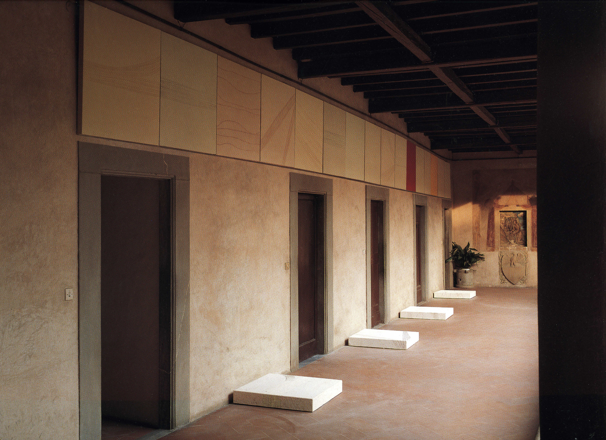 Il segno inciso e la materia cromatica vengono a consolidarsi stabili nelle superfici murarie affrescate ed ancora ad avvolgere e farsi materia assumono ruolo nello spazio ed il peso di un volume solido, oggetto tridimensionale nella realtà.