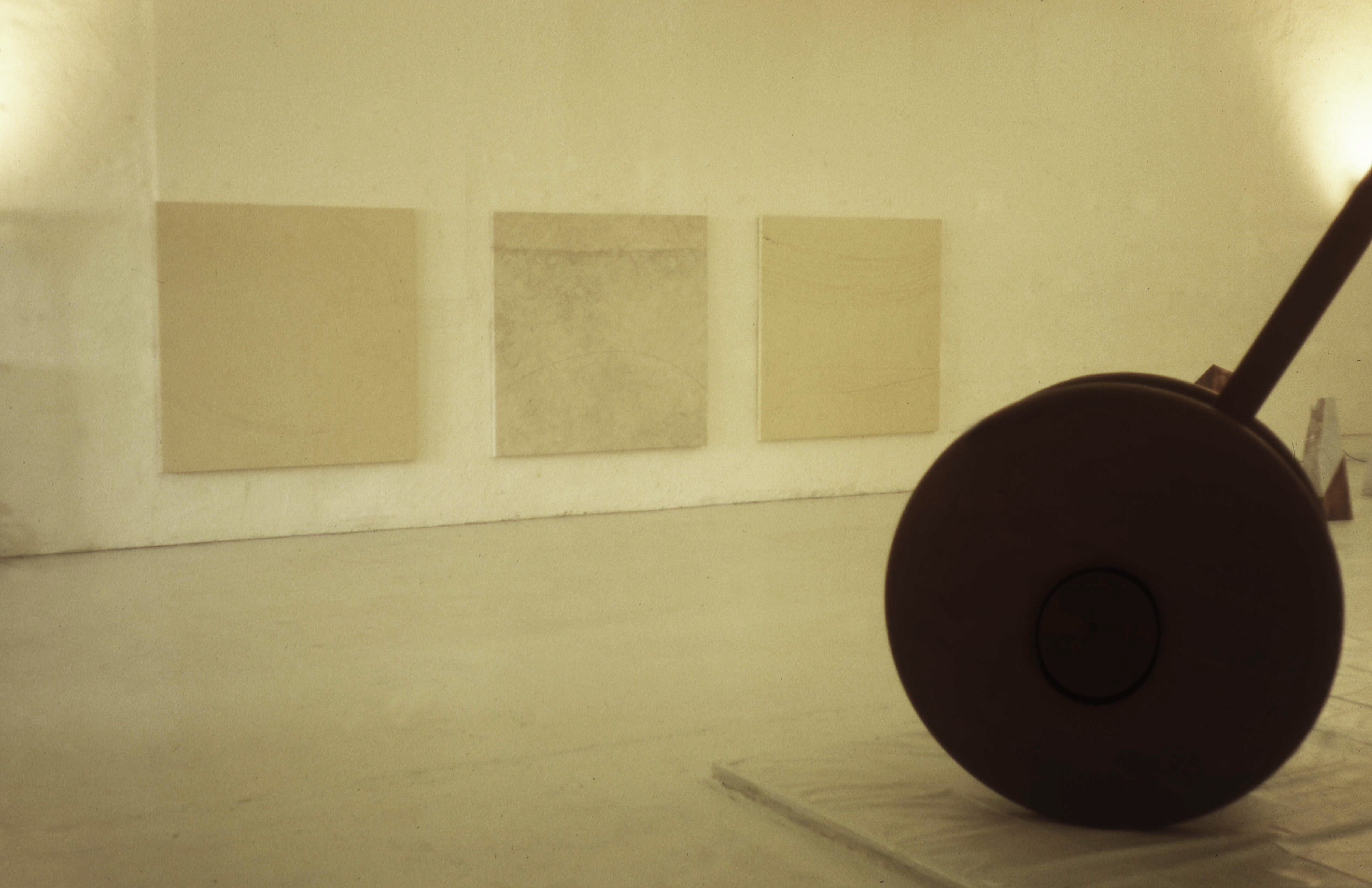 3. Alla riduzione della struttura descrittiva per brevi segni ha corrisposto un processo di azzeramento delle tensioni espressive del colore con selezione di un’ impalpabile materia .liquida, avvertibile come nebbia e appena difforme superficie epidermica. Il segno è avvolto sulla carta da una materia liquida che si distribuisce senza grumi ed il cui ruolo è uniformare, smussare l’emozione,lasciare che la nostra percezione, lo sguardo e la sensibilità si.perdano in essa. Nelle tele la pittura è similarmente portatasi distende e si distribuisce si viene a raccoglie nel solco tracciato, rinforzando, quindi se stessa e l’incisione. L’impalpabilità qui è sostituita dalla presenza fisica di una. materia intensa e ricca di valori emozionali; l’opera pittorica si fà parete, sede della, comunicazione, superficie incisa, ma anche spazio del fluire del tempo, inscrizione della memoria senza contorni, dove, il valore astratto che si ricostruisce nella sensibilità.