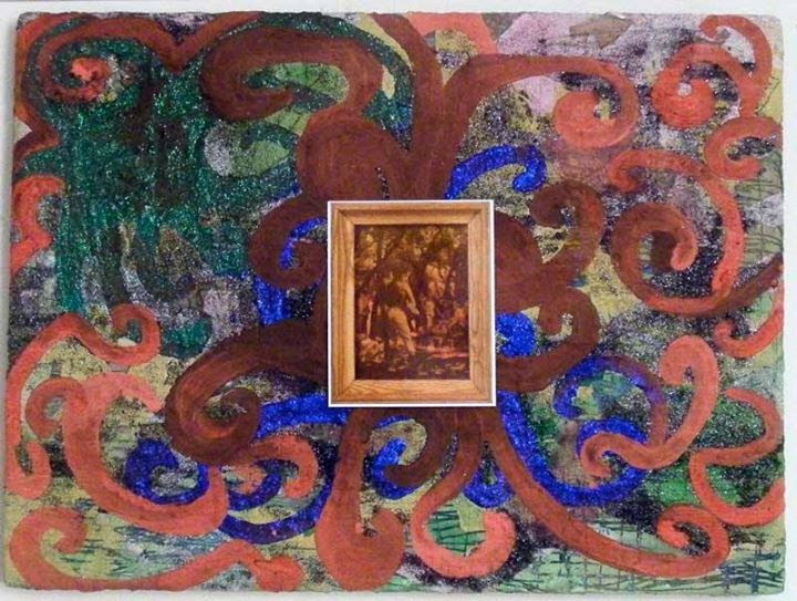 Alcuni anni dopo una di quelle grandi pagine di pittura-collage-scrittura-immagine, mi fu avventurosamente consegnata e donata da Marcenaro entrando a far parte attivamente della mia casa e quindi della quotidianità della mia famiglia; realizzata su un supporto semirigido, l’opera si qualifica attraverso un’ampia distesa di un verde prato, solcato da segni di forza, qualificato dalla tattilità delle sabbie, caratterizzato dalla forza evocativa di un’immagine sacrodevozionale.