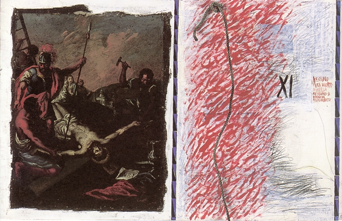 Valori formali ed uno scarno contenuto estetico-concettuale qualificano due stazioni strettamente correlate dalla definitiva ‘caduta’ del corpo dell’uomo figlio di Dio; la pittura, pur variamente presente lungo tutto il ciclo di opere, assume in questo momento una definitiva funzione di spaesamento rispetto alle dimensioni storiche ed ancora contingentemente umane nel presente del dramma della croce; una pittura che nasconde la stessa e più intima difficoltà dell’uomo e dell’artista al confronto, alla comprensione, al giudizio degli avvenimenti che non abbandonano la storia dell’uomo.