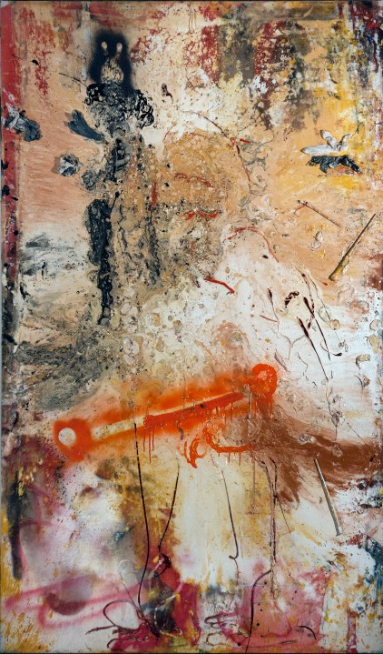 Lo sviluppo per tre metri e cinquanta in altezza, su una base di appoggio regolare, rivela la consonanza tra la struttura antica della ‘pala d’altare’ e il processo di elevazione della Croce; l’atto strutturale di innalzamento, in cui si emblematizzano le dialettiche funzioni del monito e del passaggio, dell’esperienza come colpa e della redenzione attraverso una nuova vita, permettono ed esaltano il movimento espansivo del un colore, la sua fisicità e tensione, contrassegnato da una liquidità densa e rappresa.