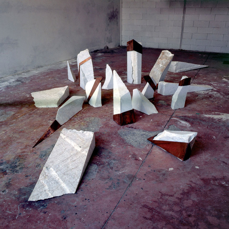 Rispetto ad una stagione a lungo fondata sul confronto del legno e della plastica con la predominante presenza del ferro, la produzione di questi ultimi anni, 1992/94 appare marcatamente caratterizzata dall’impiego di frammenti spezzati di basalto e soprattutto di marmo carrara in dimensione e peso diverso su cui interviene, anche solo a tratti fasciante ed in limitata porzione rispetto all’estensione del blocco, il rame, ora in forma meccanica di morsa, ora di piastra, disco, anello ed ancora con autonomo valore di struttura scultorea.