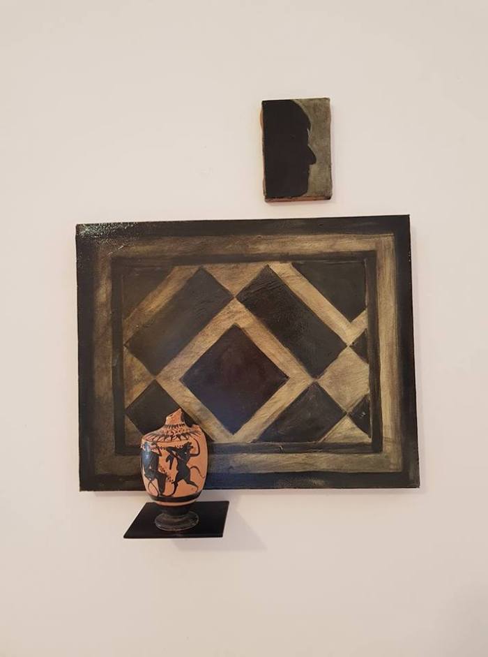 Stefano Donati “Del decoro,la silhouette II” Vaso della Magna Grecia, IV sec a.C. Acrilico su tela 40×50 e 15×10 2009 Una piccola e raffinata installazione racconta la sensibilità di Stefano Donati cresciuta nel profondo rapporto con la cultura antica, con l’archeologia vissuta e interpretata, riletta nella contemporaneità. Il frammento antico, la natura di reperto fragile e elegante, si rivela in grado di esplicitare, attraverso l’azione di configurazione spaziale e di mirata aggiunzione pittorica condotta da Donati, una valenza che si proietta oltre la sua stessa dimensione oggettuale. La struttura compositiva dell’opera, arriva a configurarsi intrigante simbolo di un patrimonio che attraversa il tempo, che persiste nei tempi, vissuto dall’autore tra passato e attualità; è l’oggetto stesso a produrre attraverso il linguaggio della pittura quella che possiamo definire emozionalmente una dimensione poetica.