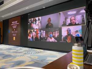 Andrea B. Del Guercio, Luming Zhang (in basso a sinistra) e Alfredo Romio (in basso a destra) in collegamento.