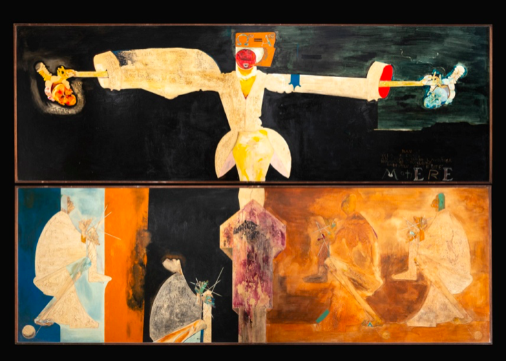 Giannetto Fieschi “Dall’alto del patibolo Antonio Lavoisier dimostra e proclama l’industrittibilità della materia ” tecnica mista su masonite, cm 390×525,1964.