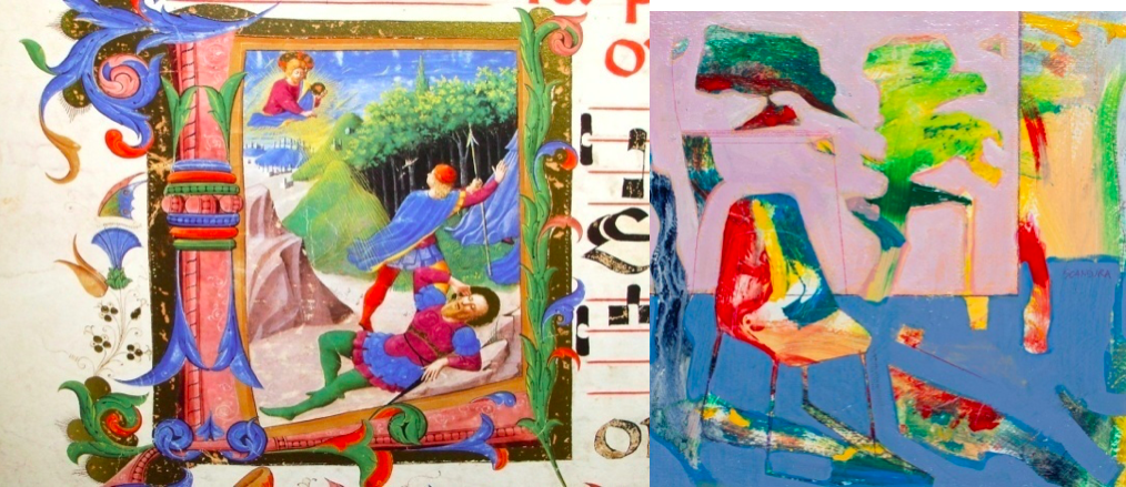 Una cultura visiva in cui si affermava la dimensione incisiva del ‘colore disegnato’, era alla base di quel primo incontro del tutto casuale e non programmato; lo spazio pittorico, contrassegnato significativamente dal formato quadrato del supporto, ospitava la perfetta relazione tra l’estensione monocroma del fondo con la struttura dettagliata del soggetto. Nella definizione “perfetta relazione” intendo riferirmi alla percezione di quel rapporto riscontrabile nella nobile cultura degli incunaboli dove la miniatura rinascimentale dettaglia l’immagine tra la vivacità del colore e il disegno della figura, delle architetture e degli stessi paesaggi. La memoria visiva mi aveva subito supportato andando a suggerire l’esperienza vissuta in epoca universitaria nella schedatura delle miniature di Zanobi Strozzi, raccolte ed esposte nel Museo di San Marco a Firenze; la relazione tra autori di stagioni così distanti, tra lo stesso Zanobi Strozzi, allievo del Beato Angelico e Piero Scandura, era del tutto evidente attraverso l’impiego della scala cromatica gestita a contrasto nelle relazioni proposte da un sistema espressivo fondato sulla definizione delle ‘forme’, frutto di una ‘concettuale’ sagomatura dei soggetti presenti: è utile leggere ed estrapolare dalla descrizione che Giorgio Vasari ci fornisce — nella Vita di Frà Giovanni da Fiesole — della cultura policroma nella redazione di preziosi libri minati: “In detto libro [Silio Italico] Ha i calzaretti gialli… [Publio Cornelio Scipione] ha indosso una corazza gialla, i cui pendagli e maniche di colore azzurro… Le calze sono di color verde e semplici e la clamide, che è azzurra, ha il didentro rosso con un fregio attorno d’oro… [Annibale] Ha in testa una celata gialla, per cimiero un drago verde e giallo… ha la corazza azzurra et i pendagli parte azzurri e parte gialli, con le maniche cangianti d’azzurro e rosso, et i calzaretti gialli. La clamide è cangiante di rosso e giallo, aggruppata in sulla spalla destra e foderata di verde; e tenendo la mano stanca in sulla spada, posa in una nicchia di mischi gialli, bianchi e cangianti… [papa Nicola Quinto è inserito in una nicchia] verde, bianca e rossa.”