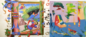 The basis of that first completely fortuitous encounter was a visual culture where the incisive dimension of “drawn colour” was established; the pictorial space as qualified by the support’s square format can host the perfect relationship between the background’s monochrome extension with the subject’s more detailed structure. When I say “perfect relationship” I refer to the perception of the relationship found in the noble incunabula tradition, in which the Renaissance miniature presents an image enriched by both the bright colours and the detailed figures, architectures, and landscapes. Visual association came to my aid by suggesting the experience I lived in my university years filing Zanobi Strozzi miniatures, collected and exhibited at the San Marco Museum in Florence; the relationship between authors belonging to so distant periods, Zanobi Strozzi, pupil of Blessed Angelico, and Piero Scandura, is completely evident when considering the use of the chromatic scale based on contrast in the relationships made possible by an expressive system founded on the definition of “forms”, the result of a “conceptual” outlining of the subjects being included: it is useful to consider the description Giorgio Vasari provides us with — in the biography of Fra Giovanni da Fiesole — of the polychrome culture that marked costly illuminated manuscripts. “In this book the figure of Silius Italicus is wearing yellow buskins… [Scipio Africanus] wears a yellow cuirass whose sword-belt and sleeves are azure… the hose are green and quite plain; the chlamys, which is azure, has a red lining and a border of gold. (…) [Hannibal] wears a helmet of yellow colour; the crest is a dragon, the colours of which are yellow and green. (…) The cuirass is azure; the belt, with its pendants, is partly azure and partly yellow; the sleeves are changeable, or shot azure and red; the buskins are yellow. The chlamys (…) is changeable red and yellow: it is fastened on the right shoulder and lined with green; with the left hand he leans on his sword, and is placed within a niche of varicoloured marbles, the colours of which are yellow, white, and changing. (…) [Pope Nicholas V is placed in a niche of] green, white, and red.”
