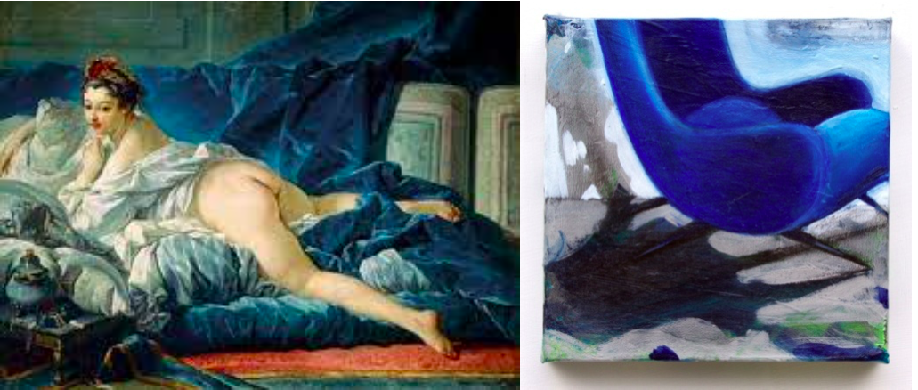 Each painting, supported by the presence of a multitude of “drawings” and a series of “preparatory studies”, is accompanied by a “photographic” catalogue dedicated to those well-known and widely distributed prototypes of chairs, armchairs, and chaise lounges and sofas, in some cases paired by low tables that “inhabit” what become extremely vibrant living rooms. These tangible presences are donned with a rich series of cinematic references able to “animate the scene”, to enhance the scene’s vitality through joyful carefree pastel colours, while bolder blues and reds impose themselves as matador-actors, flaring and raging, only to make room for the cold blue light of a clear sunrise over the sea, then the warm shadows of an orange sunset, pervaded by purplish fears.