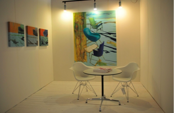 To linger and behold means to gather precious data, knowing that when the time will come to ponder and draft a critical contribution one will have access to a whole series of tools to process said data; our gaze rests and wonders to dwell upon the large square canvases, thrilled by the all-enveloping void of broad dialectically bright layers of colour, often preferring acidic tensions such as light greens, oranges clashing with fuchsia, yellows with blues, haunted, as in thoughts in the night, by the blueish shadow of a spiderlike chair.