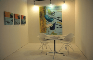 Ogni dipinto, sostenuto dalla presenza di una miriade di ‘disegni’ e da una serie di ‘studi preparatori’, ospita un Catalogo ‘fotografico’ dedicato a quei prototipi, noti e ampiamente distribuiti, di sedie, poltrone e chaiselongue che diventano divani, in alcuni casi accompagnati da tavoli bassi che ‘abitano’ salotti vivacissimi. Si tratta di vere e proprie presenze, sicuramente tangibili, con una ricca serie di riferimenti cinematografici in grado di ‘animare la scena’, di spettacolarizzare la vitalità attraverso la spensieratezza gioiosa dei colori pastello, mentre i blu e i rossi più ‘carichi’ stravolgono imponendosi come attori-mattatori, per poi lasciare spazio alla fredda luce azzurra di un’alba chiara sul mare, poi le calde ombre di un tramonto arancio, pervase da angosce violacee.