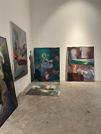 - Finally, the painting room, where canvases of various sizes are placed, along with more easels and a table to assist in choosing colours and the action of numerous brushes. In this room, the floor tells of the creative function of the workshop space with the layering of chromatic materials. Here, the gaze carefully probes and reads a kaleidoscope of spinning images, decidedly unstable since they are the result of the erasure of perspective order. This suggests an independent and lively polychromatic reality, the outcome of the reworking of various iconographic systems and their contamination.