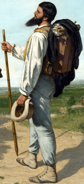 If the notion of “journey”, from the abandonment of certainties to the discovery of the new, is vital evidence of culture and science, the iconographic heritage precisely details the infinite solutions and the various contents. Here, it is useful to emphasise and place at the centre of what could be observed as a “turn” towards the modern dimension of art, the work Bonjour Monsieur Courbet (fig. 1) of 1854[21], where, for the first time and in terms of a decisive affirmation of the author’s personality, the figure of the artist is perfectly characterised – from the outdoor easel to the cane and the travel gaiters, in open contrast with the boots and the light walking stick of an all too “reverent” Alfred Bruyas (1821-1877), friend and collector of Gustave Courbet – by the desire to conduct research and documentation outside the studio, aimed at the discovery and transcription of the new, as encountered, the outcome of walking along new roads, crossing territories, and entering into relationships. A fundamental framework in the projection and development of roles and sensibilities that leads to a new figure of artist: “The history of an era ends with the era itself and with those of its representatives who expressed it […]. One must never start again, but proceed from synthesis to synthesis, from conclusion to conclusion. The true artists are those who capture an era exactly at the point to which it has been brought by previous times. Going backwards is like doing nothing; it is acting in pure futility: it means neither having understood nor having profited from the lessons of the past” (G. Courbet, Paris, 25 December 1861)[22].
