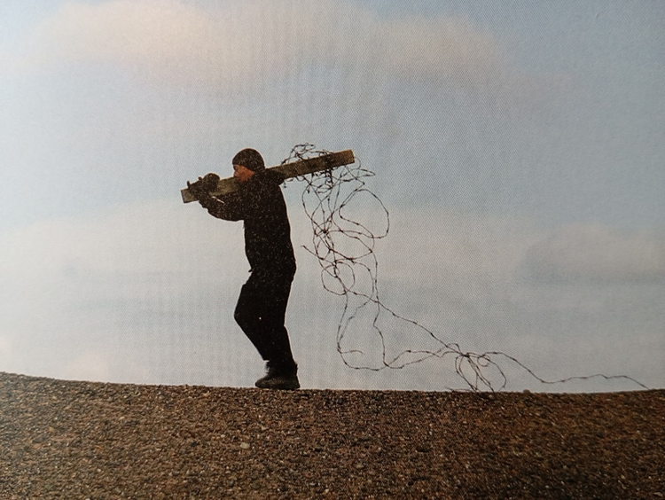 La costante presenza del valore linguistico della ‘linea retta’, risulta centrale e persistente al punto da limitare la dimensione prospettica, corrisponde al frutto evidente dei caratteri paesaggistici integri in aree desertiche, prive di contaminazioni aggiunte, dalla natura stessa come dall’uomo, ed è accolta nel processo espressivo, diventando prioritaria nella ricerca e nella definizione di uno spazio scenico. L’estensione di quel confine che determina l’alto e il basso, la dimensione fisica del pianeta rispetto a quella atmosferica della volta celeste, contrassegna lo sguardo cinematografico e predispone all’installazione di reperti plastici, i mattoncini di alabastro come il tavolo bianco dell’Ultima cena’, fornendo al fruitore l’architettura teatrale dell’immagine e la loro successione spettacolare degli eventi e della comunicazione umana.
