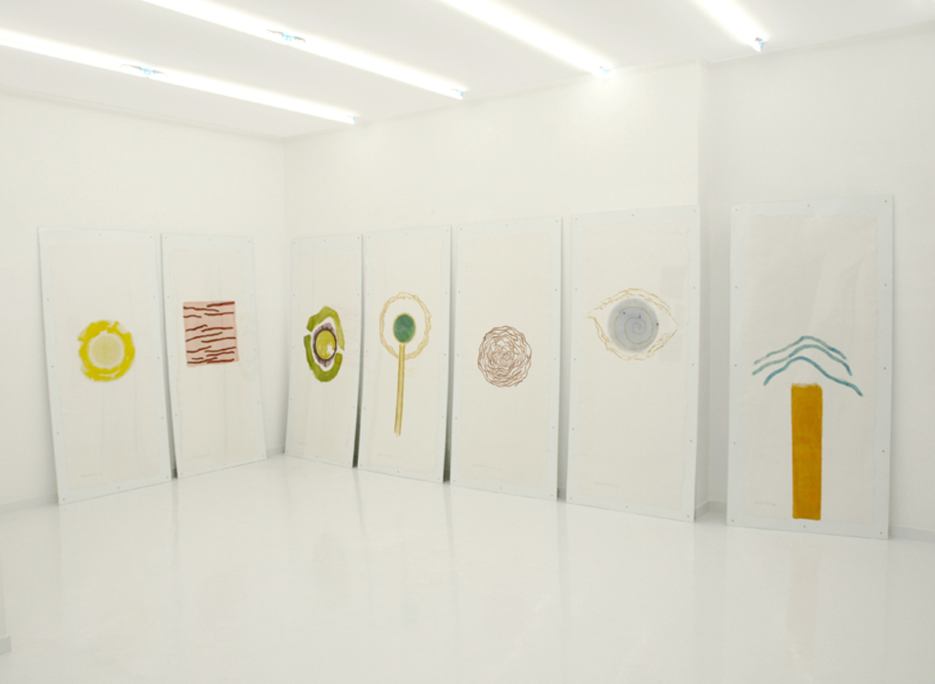 All’origine del percorso espositivo pistoise stanno infatti un ampio ciclo di opere la cui incisività espressiva si fonda, ora sulla tangibilità dei materiali, l’MDF (pannelli di legno truciolare pressato) e l’acciaio, ora sulla forte percettibilità cromatica del blu e del giallo, dell’arancio; mentre per ogniuna di esse vige l’esigenza espressiva di una preminenza di valori progettuali, sia teorico-formali che meta-linguistici, la collocazione d’insieme esalta e ridistribuisce sulla natura di ogniuna la condizione di uno stretto rapporto e di una costruttiva dipendenza con la specificazione di una concezione estetica dello spazio e del tempo maturata in senso orientale e raccolta nella definizione ideogrammatica del ma.