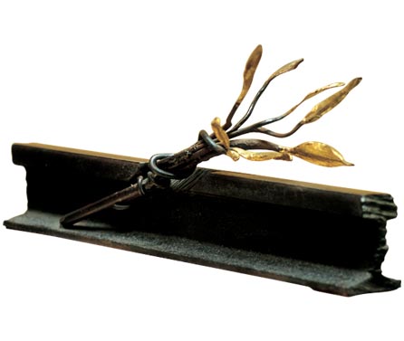 E’ all’intero ed in relazione con questo clima sfaccettato della cultura artistica contemporanea e della scultura in termini di specifica avventura linguistica, che il patrimonio complesso e segreto, contradditorio come deve essere in ogni essere umano attento alla sensibilità, delle emozioni e dei sentimenti trova spazio per una affermazione nitida e diretta, rigorosa e quasi disarmante: il ramo e le foglie, lo stelo ed un boccio di rosa forgiato nel ferro.