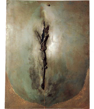 La volontà di auto-dichiarazione, di un’espressività subito e dichiaratamente disvelata nella sua natura immediata, si pone in evidenza attraverso il fattore della superficie piana, del foglio di carta, della lavagna; la grossa lastra di ferro è infatti testimone di una lucida intensità narrativa ch si costruisce e si articola in un’inquietante clima di auto-spaesamento, di abbandono delle riservatezze e di quei segreti per secoli racchiusi nel volume, nella massa materica.
