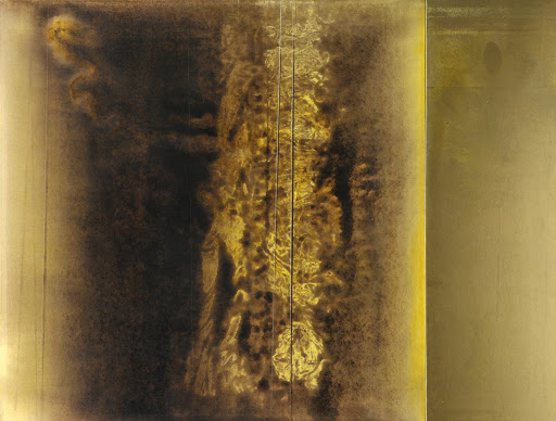 Un percorso che si raccoglie nel ciclo di opere dedicate tra il 2007 e il 2008 alle ‘Traiettorie, tracce,impronte, pieghe’ e caratterizzate da attente variabili sull’espansione dei rossi, dalla contaminazione dei gialli e dagli aranci, tra espansione delle liquidità e grumi di materia luminosa dei bruni e nel nero; toccante è la grande ‘Foresta pietrificata ’ del 2007 a cui si collega ‘Impronte’ del 2009; la nuova pala incentrata sul tema della Morte, sulla traccia impressa nella materia, confermata dalla persistenza del ricordo, collega il suo essere alla riflessione attraverso il pigmento caldo dei marroni bruciati, si fonda e discende dentro materie assorbenti e calde. Se la Resurrezione puntava all’elevazione e al suo stare nella luce, la Morte sosta su se stessa ma riconosce alla luce le radici vitali del suo essere; una pittura che si fa movimento del pensiero per la comprensione dell’esperienza umana, anche attraverso l’esperienza spirituale.