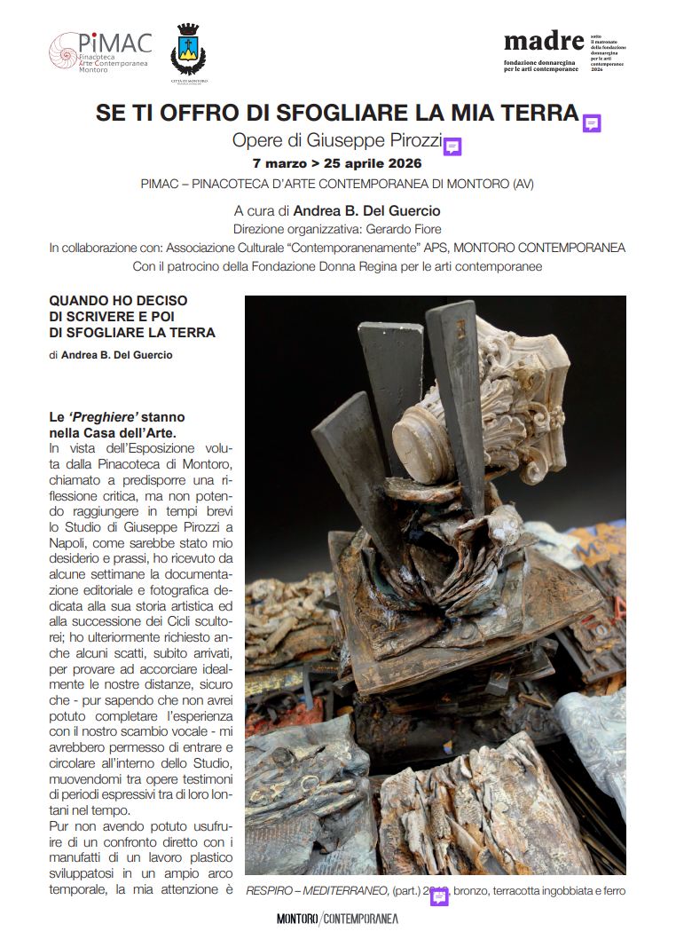 In preparation for the exhibition sponsored by the Pinacoteca di Montoro, I was asked to prepare a critical reflection, but since I was unable to reach Giuseppe Pirozzi’s studio in Naples quickly, as I had hoped and expected, I received the editorial and photographic documentation dedicated to his artistic history and the succession of his sculptural cycles a few weeks ago. I also requested some photographs, which arrived promptly, to try to ideally bridge the gap between us, confident that—even knowing I wouldn’t be able to complete the experience with our verbal exchange—they would allow me to enter and circulate within the studio, moving among works that bear witness to periods of expression distant from each other in time.