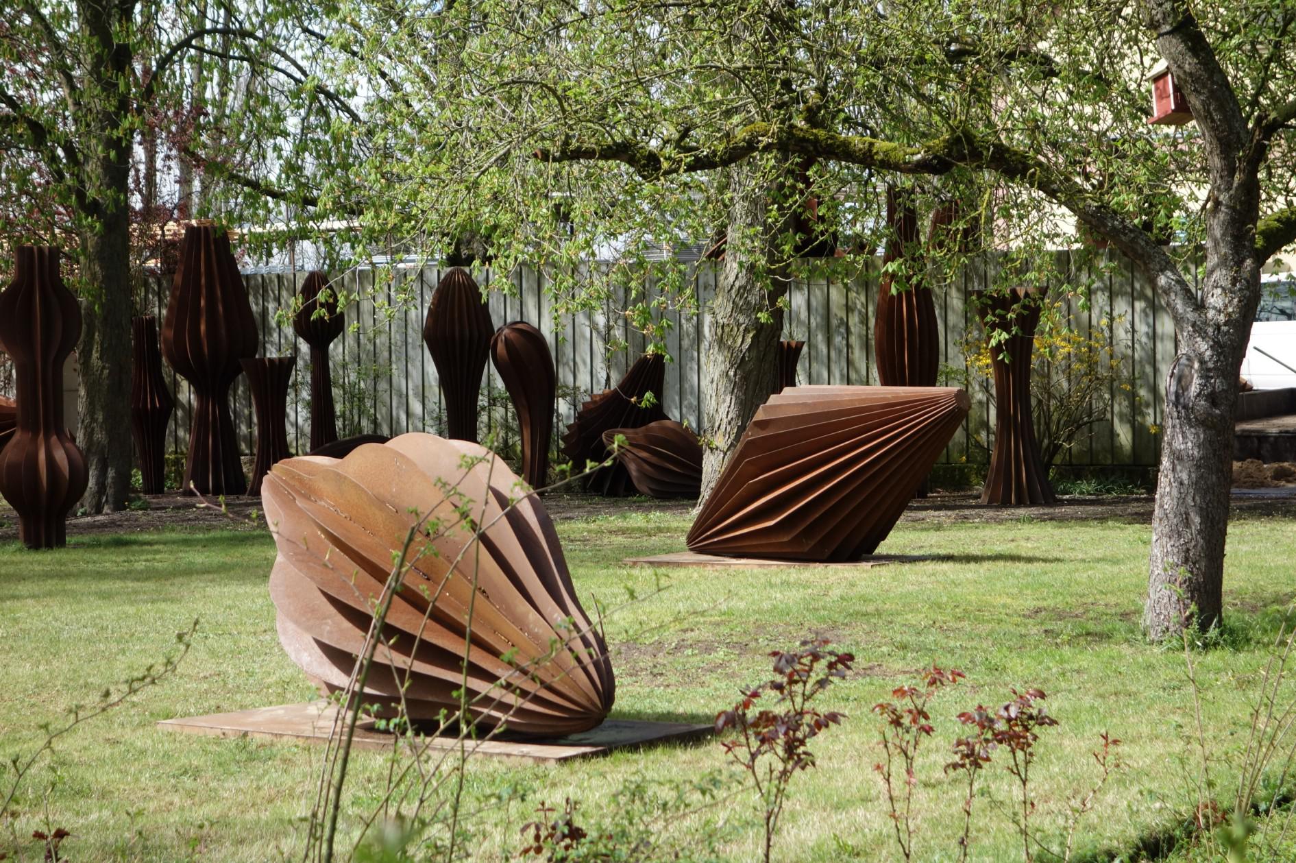 Il patrimonio di idee sul quale ha lavorato in questi anni Herbert Mehler, predisponendosi ad una produzione scultorea di notevole quantità e diversificata dimensione, verificando il terreno della “scultura dipinta”, deve essere riferita alle relazioni che intercorrono tra l’architettura strutturale del mondo naturale e vegetale ed il patrimonio di studi e di progettazione urbanistica del rinascimento. L’osservazione della dimensione formale, seguendo e sviluppando un approccio analitico testimoniato dalla cultura degli antichi erbari, ha condotto allo studio e al confronto con le piante urbane della città ideale e delle grandi basiliche, ma anche alla ricerca linguistica specifica dei moduli strutturali dell’architettura. Alberi e fiori, steli e boccioli, semi e frutti appaiono rivisitati rispetto alla forma originaria, attraverso un processo rintracciabile nella prassi di un dettagliato sguardo analitico; un percorso che si sviluppa per fasi riduttive, seguendo un processo indipendente dal naturalismo, pronto ad operare attraverso una rigorosa selezione delle grammatiche visive. Un’azione espressiva che trova nel volume in acciaio, ma anche nell’apporto del colore e di una preziosa doratura, la struttura solida di un frutto e di una pianta grassa, lo slancio dell’arco nello spazio, il tronco possente e la colonna marmorea, la sagomatura stellare di una foglia in relazione con la progettazione della città magnifica pensata dal Filarete. Si osservi quanto la costante scanalatura disegnata del volume, le centine che attraversano lo sviluppo volumetrico delle forme o che seguono e accompagnano, rafforzando le grandi elevazioni, rivelino quanta contaminazione intercorre tra la cultura dell’architettura e quella della scultura, così che l’una e l’altra si sviluppano lungo un processo plastico-ambientale.