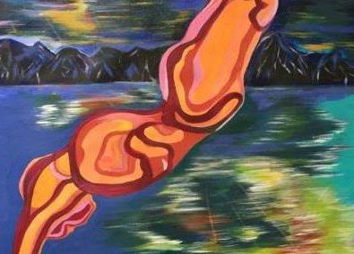 L’iconografia del corpo umano, probabile indicatore di un effettivo approccio fisico al fare dell’arte, entra nel recente ciclo di opere di Maria Balanovskaya, attraverso una contaminazione-stratificazione tra l’azione del dipingere veloce e riempitivo degli spazi, l’impiego delle mascherine e la distribuzione puntiforme del colore, frutto della pressione della bomboletta. La predilezione per le grandi dimensioni della pittura, lo stato partecipato del fare e l’horror vacui che porta a concludere l’intera superficie, si specifica nella relazione tra il corpo e lo stato liquido del fondo, comunque caratterizzato da una densità oscura del colore; in questo clima intenso si dettaglia la recente rivisitazione dedicata alla “Tomba del tuffatore”, tratta dal patrimonio archeologico di Paestum, in cui alla grazia della storica figuretta, Maria Balanovskaya sostituisce un’accensione fluorescente, una sottolineata fisicità elettrica.
