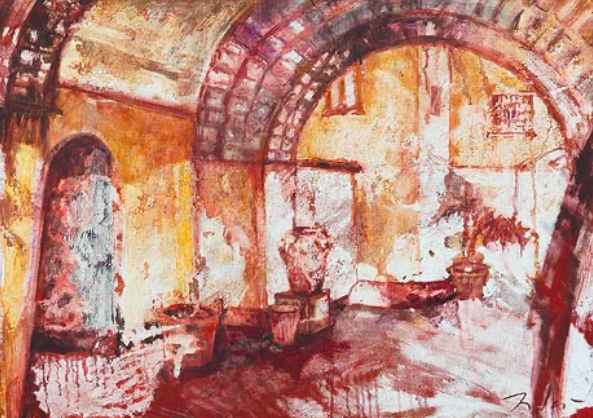 I rossi, i verdi, i gialli sono portati dalla Falco con la volontà di trattenere lo sguardo distante, direi escluso rispetto allo spazio oggettivo della città; la contaminazione segno-colore nel rapporto tra la superficie del dipinto e la prospettiva dell’architettura trattiene sull’esterno la frequentazione per andare a promuovere uno stato di presenza psicologica, una partecipazione allo spazio attraverso lo stazionamento dello sguardo e l’espansione del pensiero nel tessuto silenzioso dell’habitat: all’interno di ogni fotogramma di questo ciclo pittorico sembra raccogliersi e ricomporsi l’intera storia di un grande centro storico della nostra memoria, nella contaminazione di un tessuto globale di umanità.