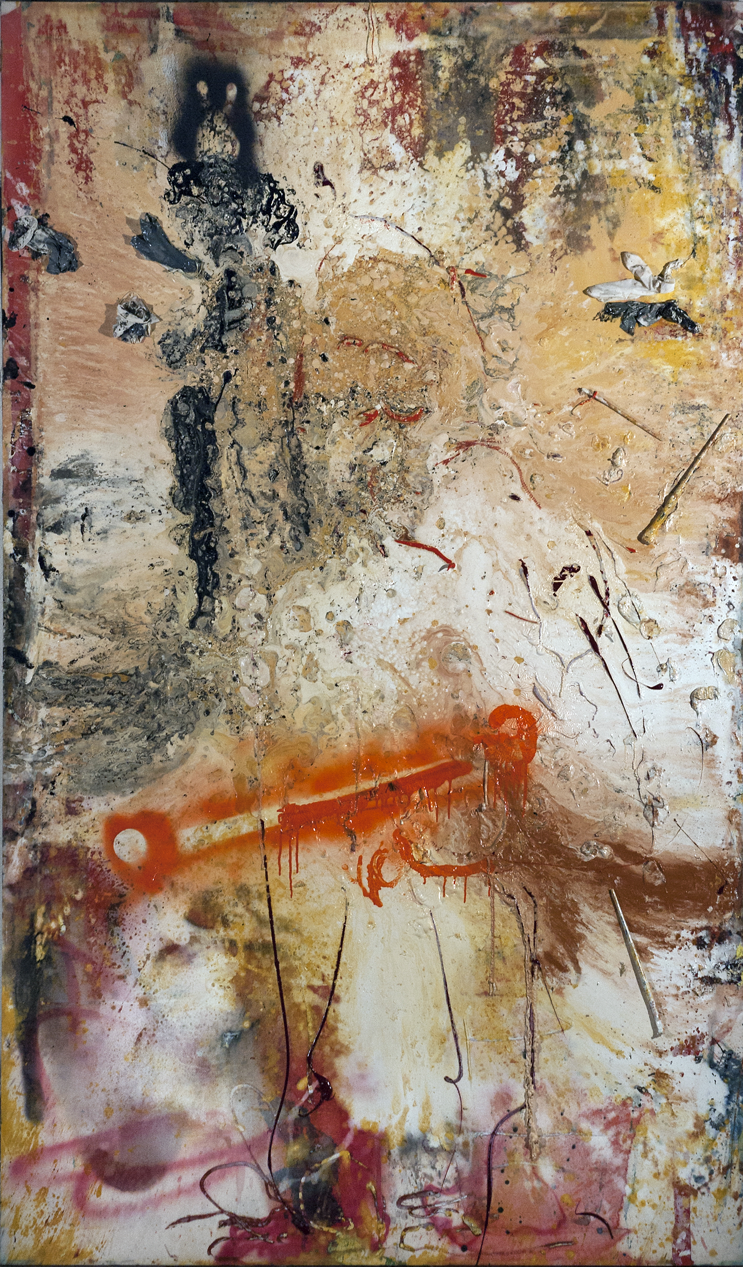 Lo sviluppo per tre metri e cinquanta in altezza, su una base di appoggio regolare, rivela la consonanza tra la struttura antica della ‘pala d’altare’ e il processo di elevazione della Croce; l’atto strutturale di innalzamento, in cui si emblematizzano le dialettiche funzioni del monito e del passaggio, dell’esperienza come colpa e della redenzione attraverso una nuova vita, permettono ed esaltano il movimento espansivo del un colore, la sua fisicità e tensione, contrassegnato da una liquidità densa e rappresa.